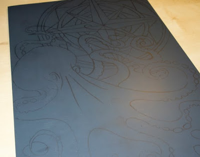 First I needed to do some drawings. I used a ruler and compass to get the basic shape of the compass, then drew the octopus freehand.